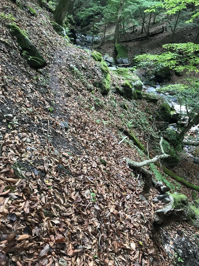 30分ぐらい歩くと林道から登山道の根本沢コースにかわり、沢を目指して降りていきます。急斜面ですが登山ルートなので道はありました。