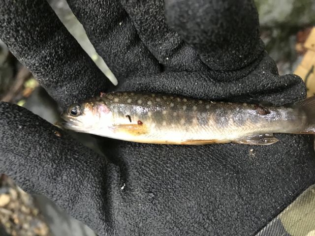 まだシラスのような感じですがベビーながらも岩魚であるマークが出始めていました。2-3年後には釣れるようになるのでしょうか?この子も本流の流れが緩い場所に移してあげました。渓流釣りでイワナの稚魚をみるのは初めてです。